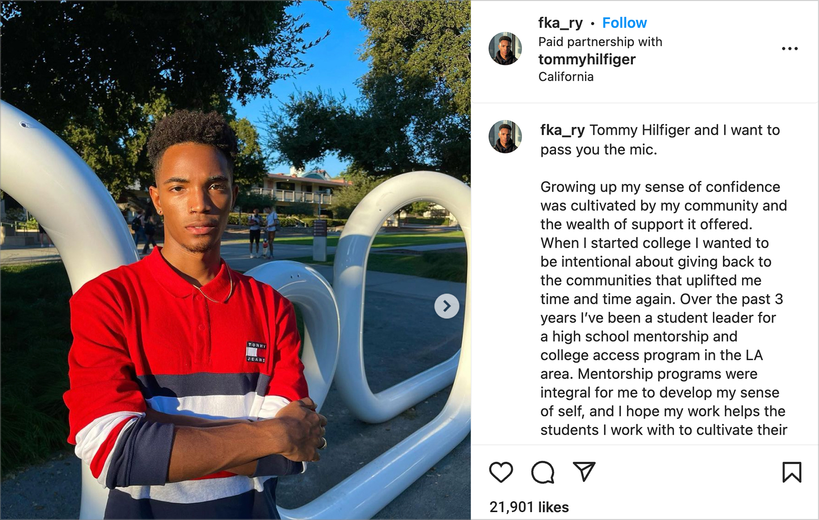 Tommy Hilfiger is an internationally admired clothing company, and the brand was seeking to engage with and support the next generation of its customers by empowering them to make a difference in their communities. People First partnered with Tommy Hilfiger to design and execute the “Pass the Mic” campaign, aimed at empowering activists from cultural hotspots like New York, Miami, and Los Angeles to share personal narratives about making a difference in their communities and “Passing the Mic” to their followers as an invitation to do the same.