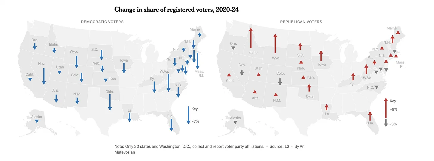 From The New York Times: “Of the 30 states that track voter registration by political party, Democrats lost ground to Republicans in every single one between the 2020 and 2024 elections, and often by a lot.