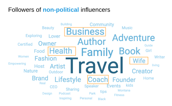 By contrast, followers of non-political creators reflect a far more varied mix. They include small business owners, coaches, health practitioners, and parents, among others.